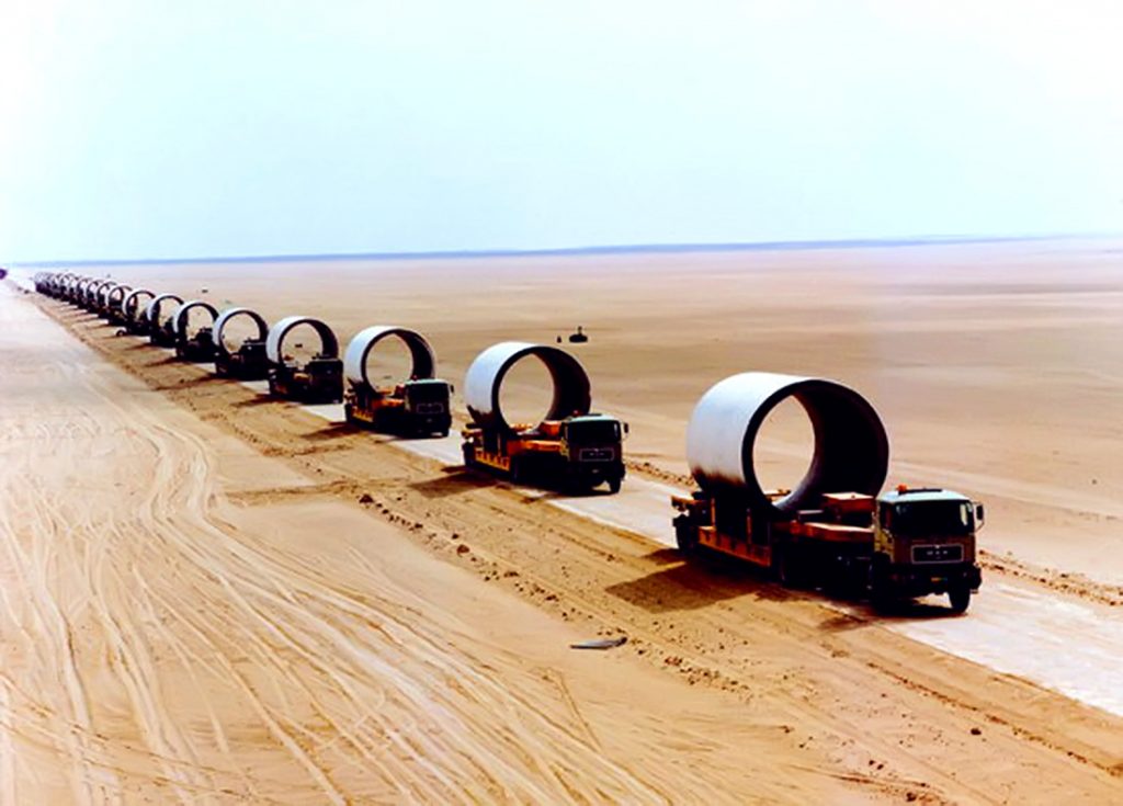 ‘Velika rijeka koju je napravio čovjek’ je mreža cijevi koje opskrbljuju vodom pustinju u Libiji… To je najveći svjetski projekt navodnjavanja… To je najveća podzemne mreža cijevi i akvadukta u svijetu. Sastoji se od više od 1.300 bušotina, većina su na više od 500 m dubine, i proizvodi se 6.500.000 m³ slatke vode dnevno, kako bi gradovima Tripoliju, Benghazi, Sirt i drugima osigurao pitku vodu. Muammar al-Gaddafi je to opisao kao “Osmo svjetsko čudo”.